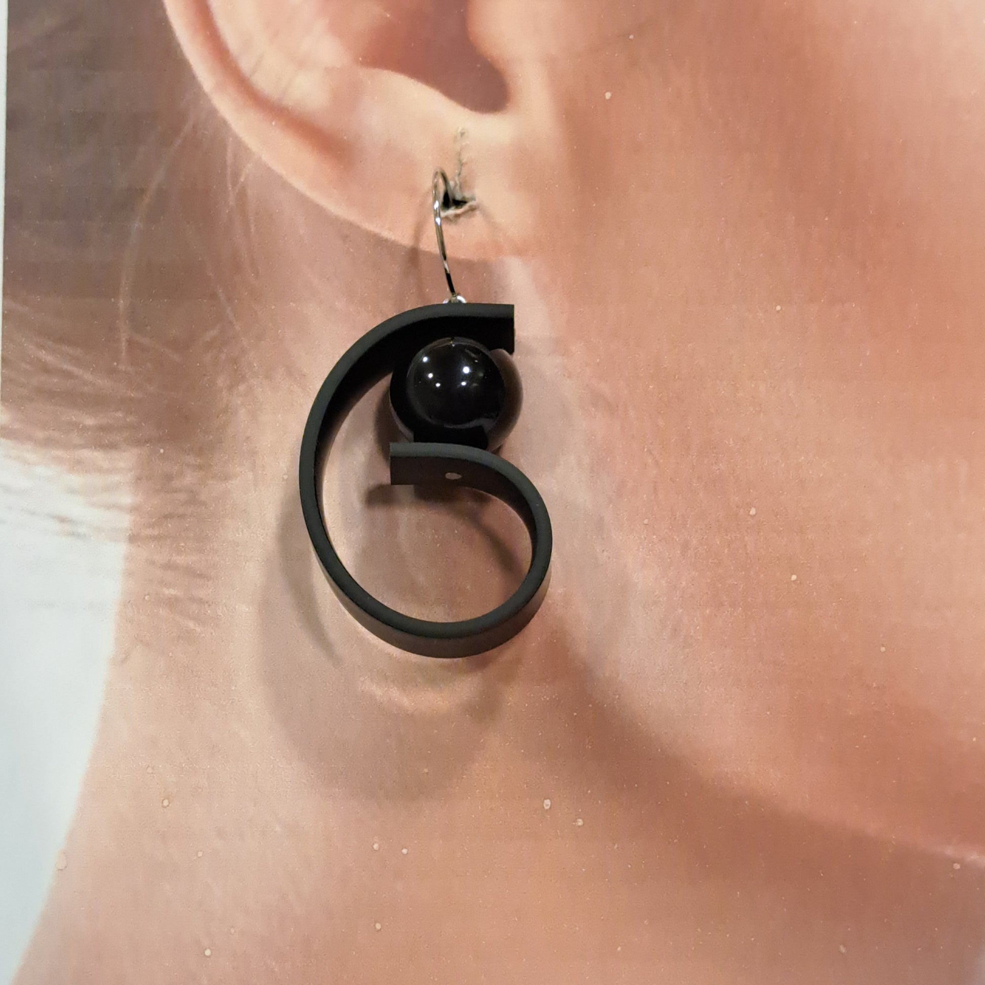 Ces boucles pour oreilles percées sont réalisées en gaine de PVC mât avec une perle en céramique, formée à la main. Montées sur un crochet en métal argenté