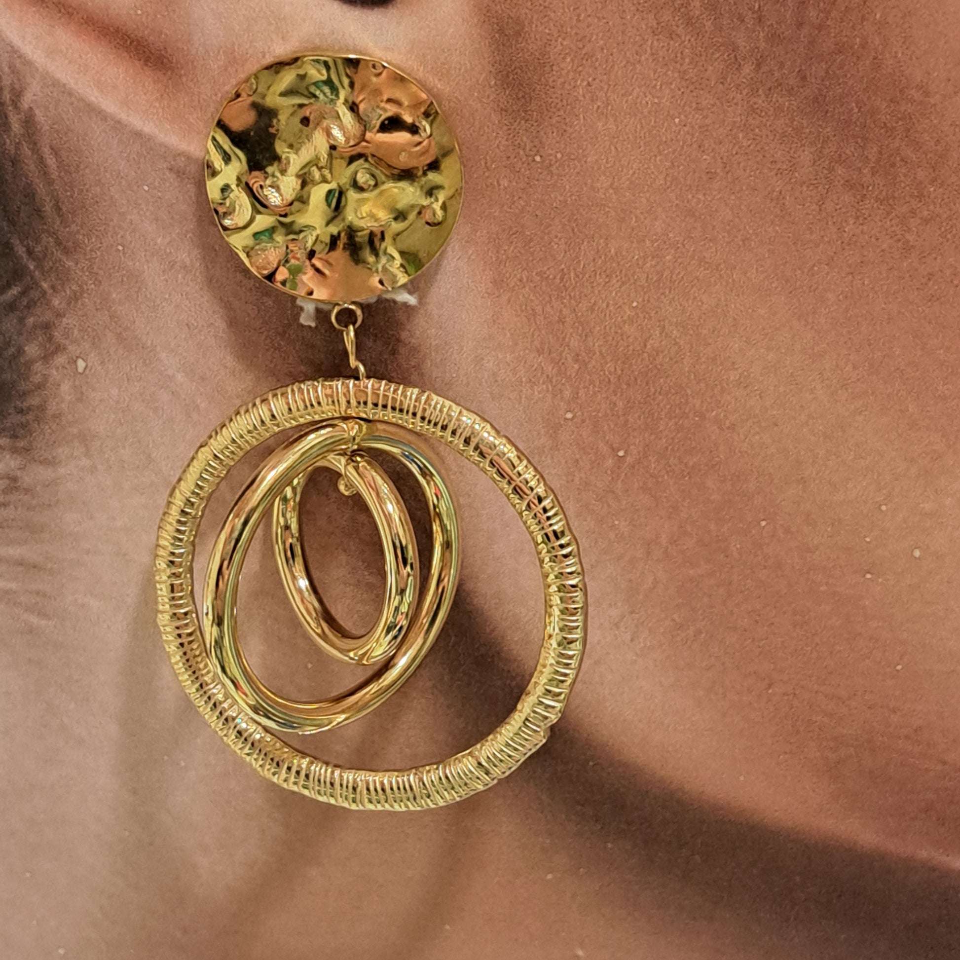 Le rond martelé sur l'oreille mesure 2cm. Les anneaux mesurent 4.5cm, 3.5cm et 2.5cm. Hauteur totale 6cm.
