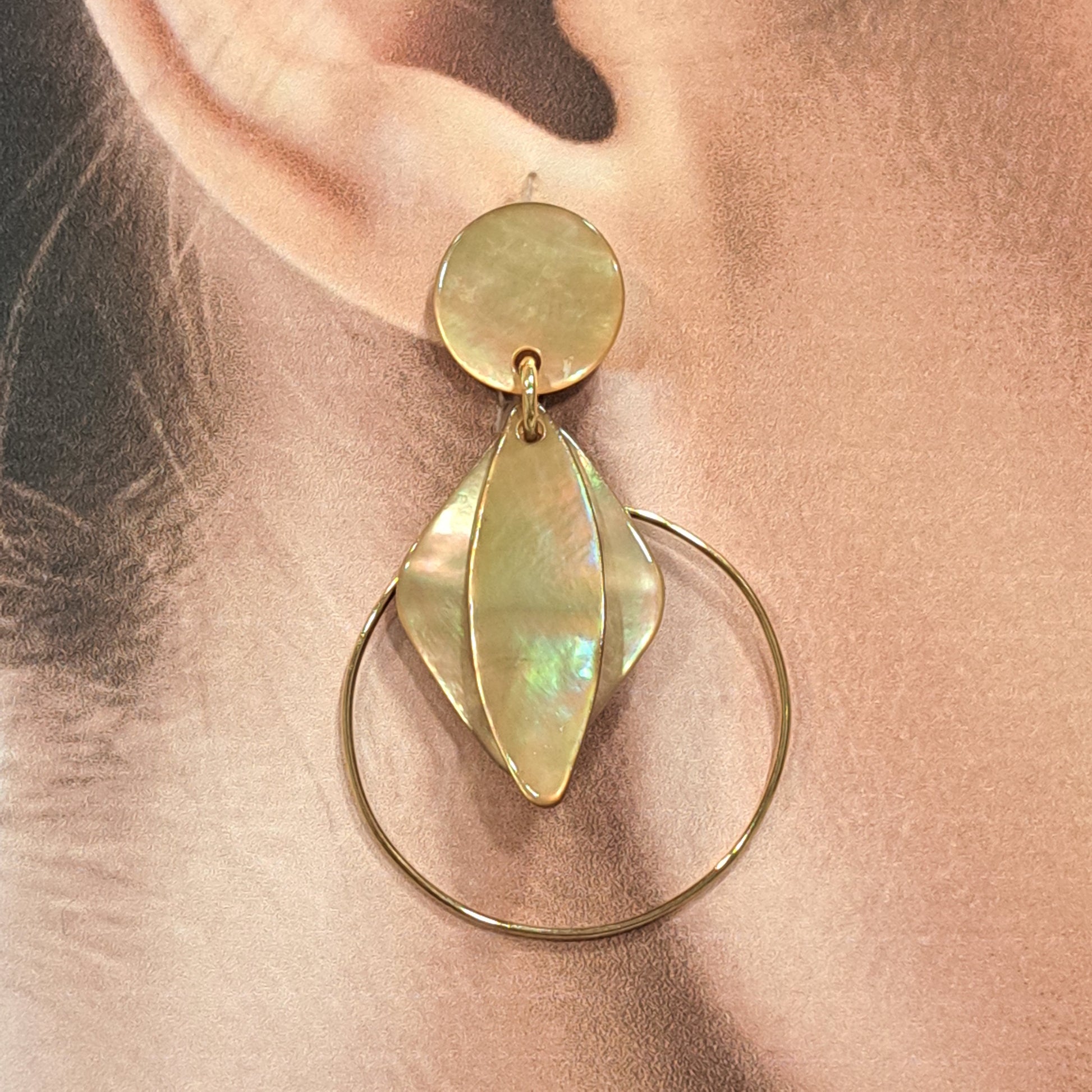 Boucles clips dorées à l'or fin et nacre émaillée. Le rond sur l'oreille mesure 1,8 cm. Largeur 3,5cm et hauteur 5.5cm.