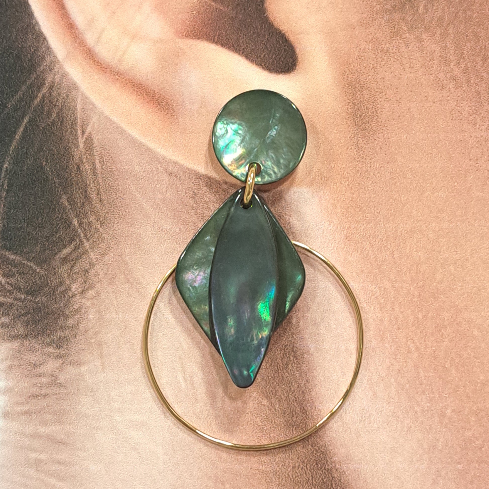 Boucles clips dorées à l'or fin et nacre émaillée. Le rond sur l'oreille mesure 1.8cm Largeur 3.5cm et hauteur 5.5cm.