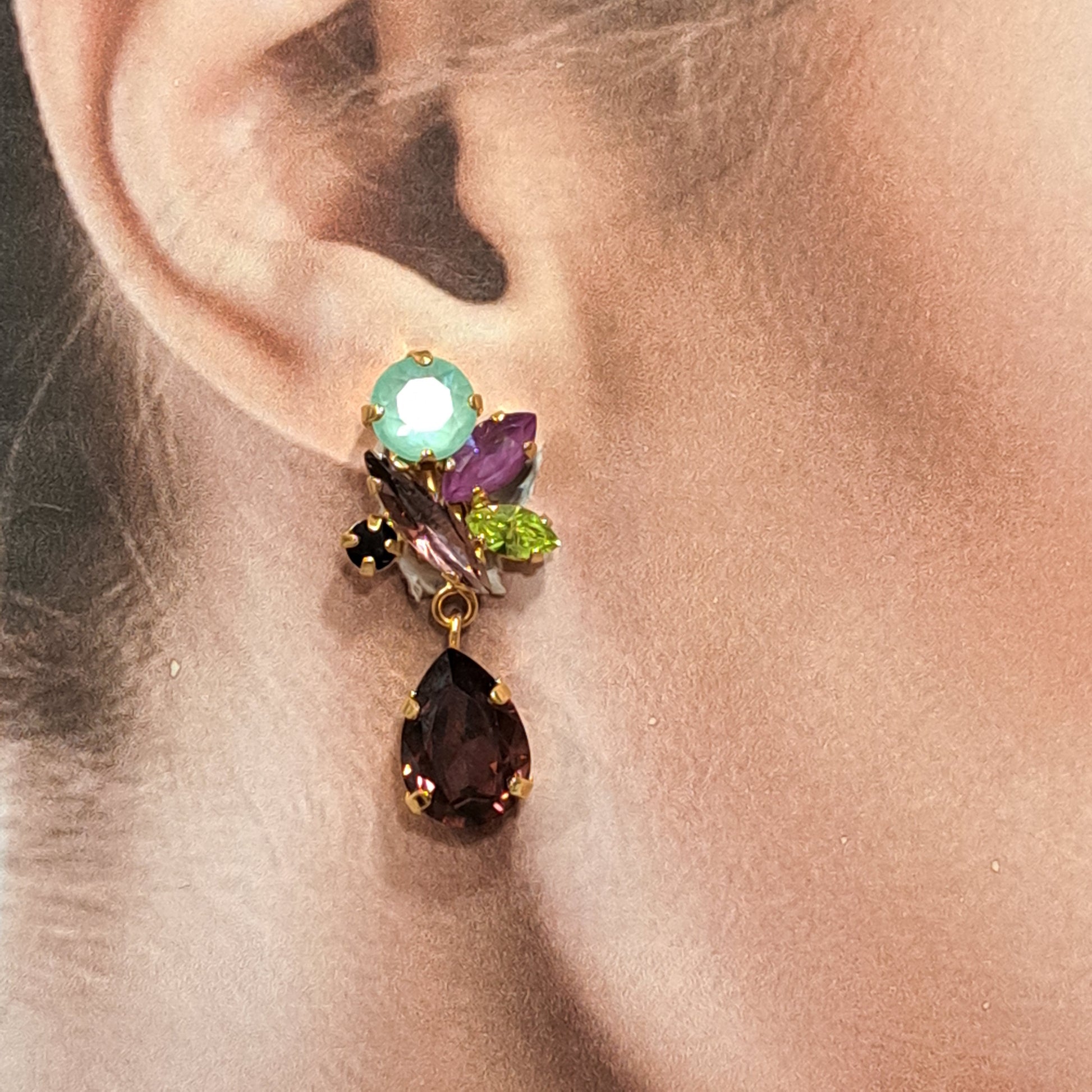 Les pierres mesurent entre 0,3 cm et 1,4 cm. Dimensions : Sur l'oreille 2 cm x 1,5 cm et la goutte 1 cm x 1,4 cm. Hauteur totale : 4cm.