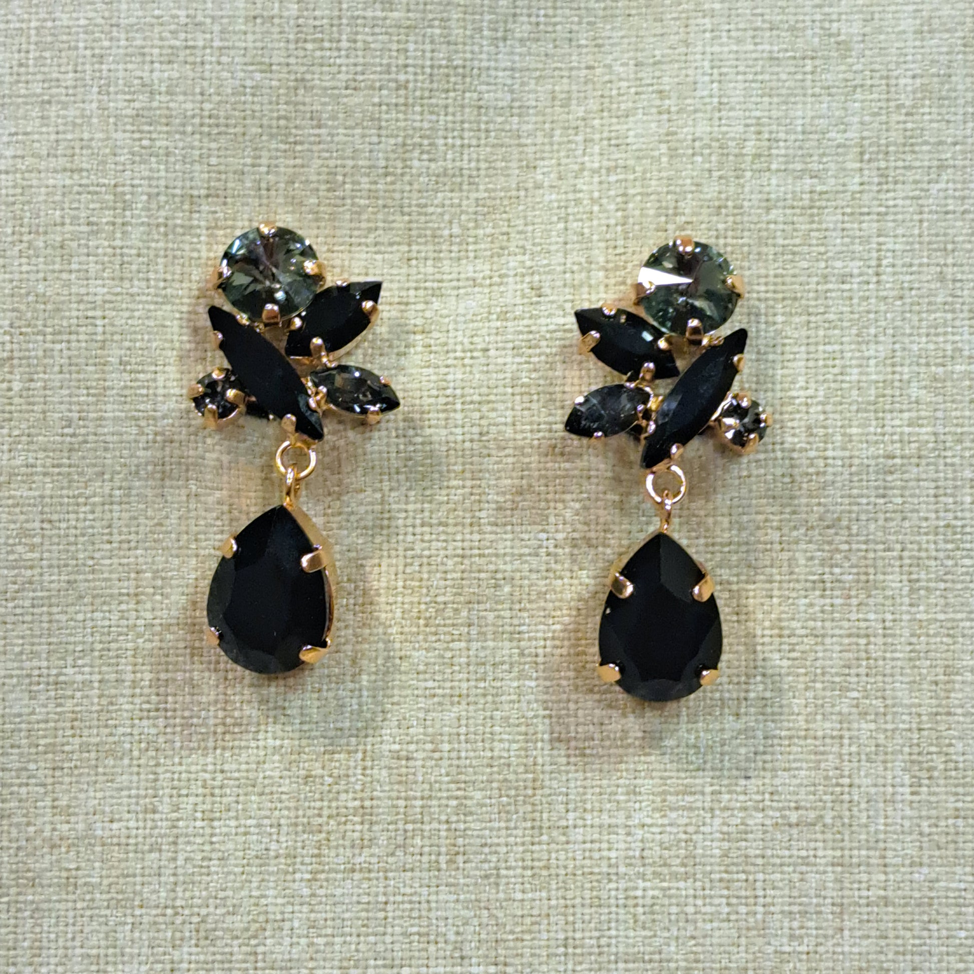 Boucles clips pendantes CREZUS en cristal de Swarovski noir gris griffé brillant et irisé.