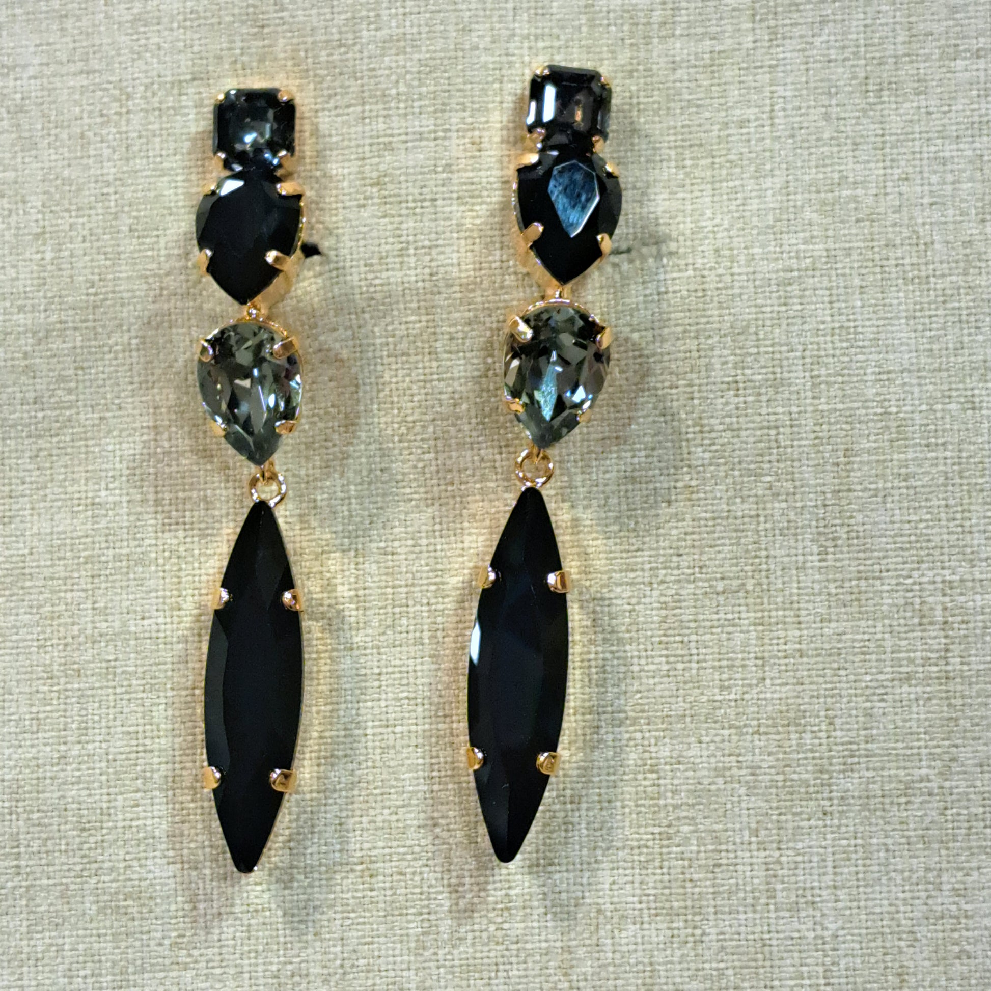 Boucles clips pendantes CREZUS en cristal de Swarovski noir gris griffé brillant et irisé.