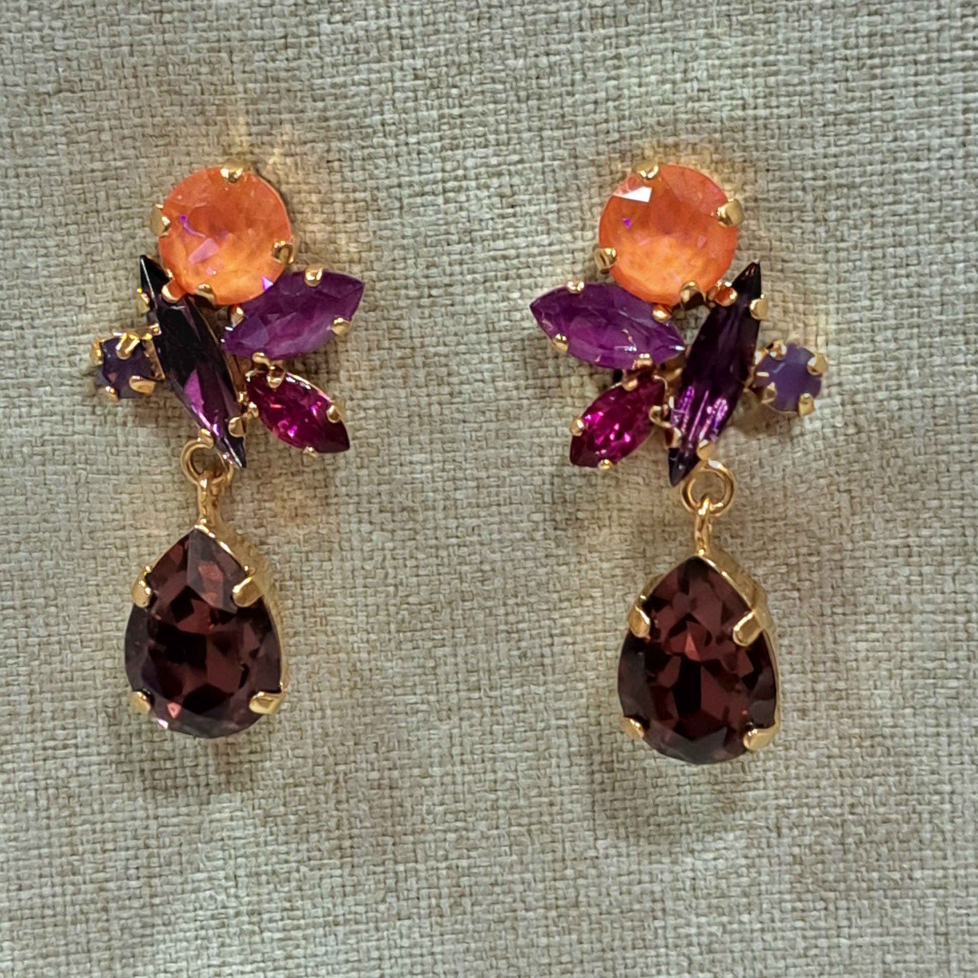 Boucles clips pendantes CREZUS en cristal de Swarovski prune, rose et corail griffé brillant et irisé.