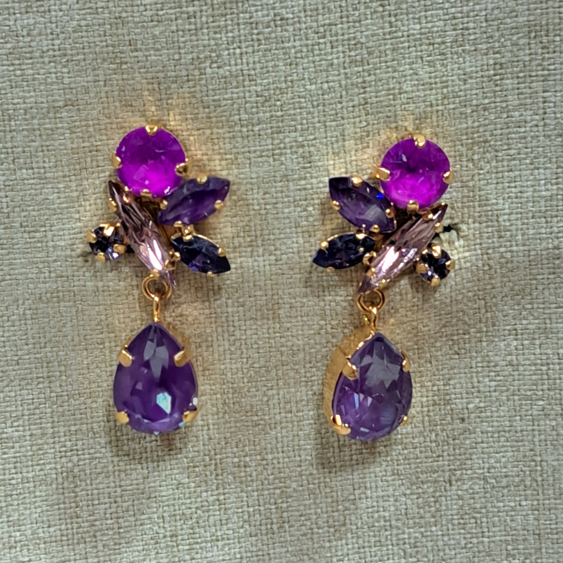 Boucles clips pendantes CREZUS en cristal de Swarovski parme violine griffé brillant et irisé.