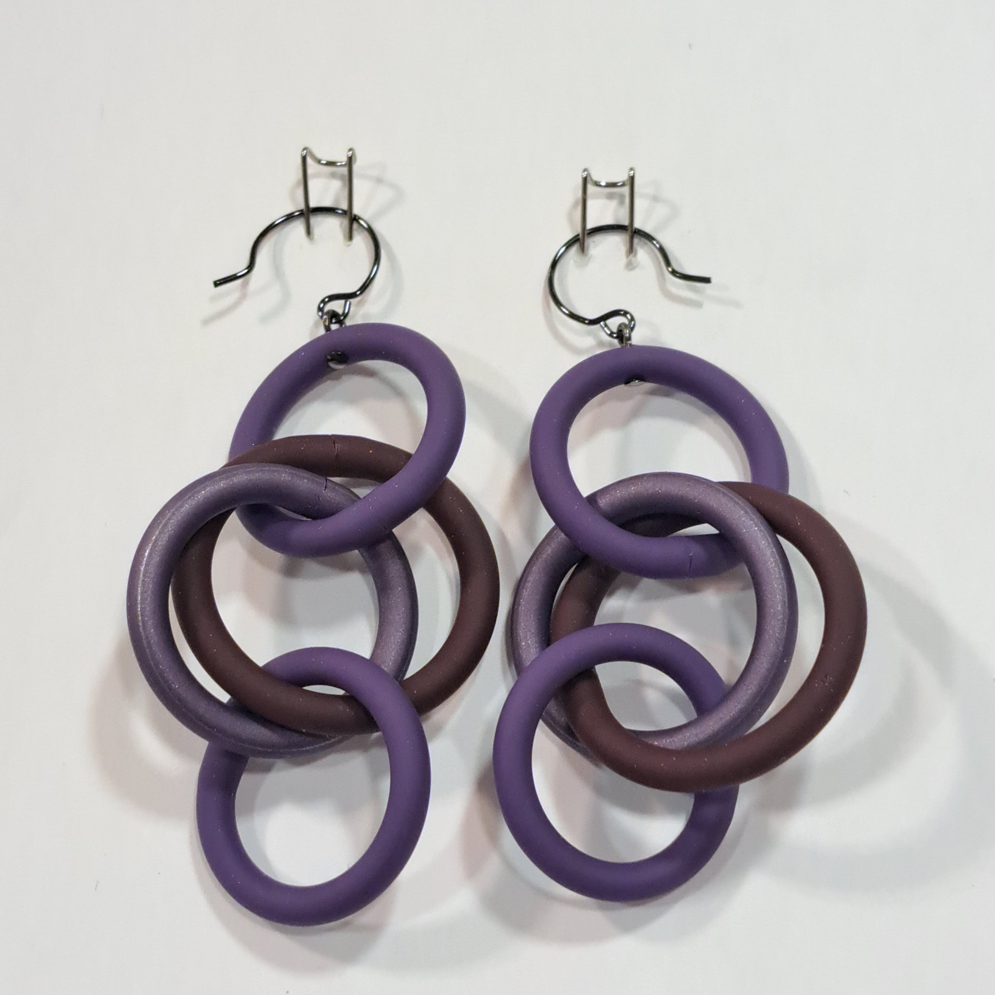 Sans nickel, fabrication française. Ces boucles sont réalisées en gaine de PVC mat assemblée. Elles sont montées sur un crochet argenté. Les boucles entrelacées mesurent environ 6cm x 4cm. Longueur totale 8cm.