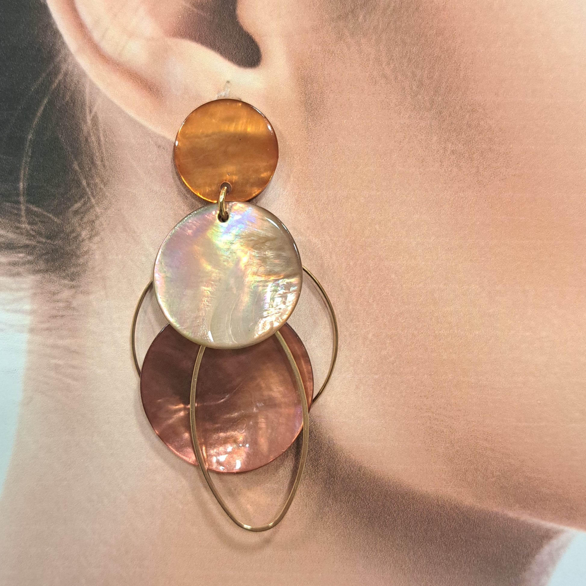Boucles clous en nacre émaillée. Le rond sur l'oreille mesure 1,8 cm de diamètre. Largeur 3,5cm et hauteur 7,5cm.
