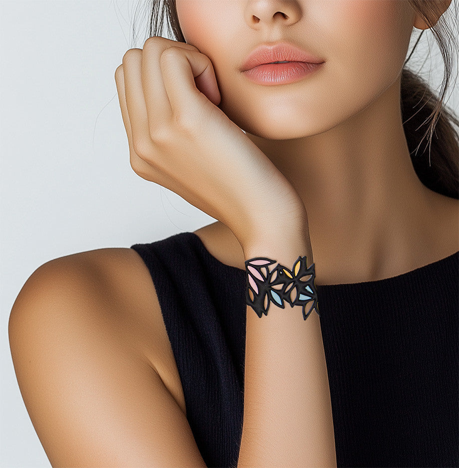 Fabriqués avec 80% d'huile végétale bio, nos bijoux sont 100% hypoallergéniques. L'effet visuel de nos bracelets est à mi-chemin entre un bijou de peau et un tatouage. Bracelet ajustable entre 14.5cm et 18.5cm. Largeur 4cm.