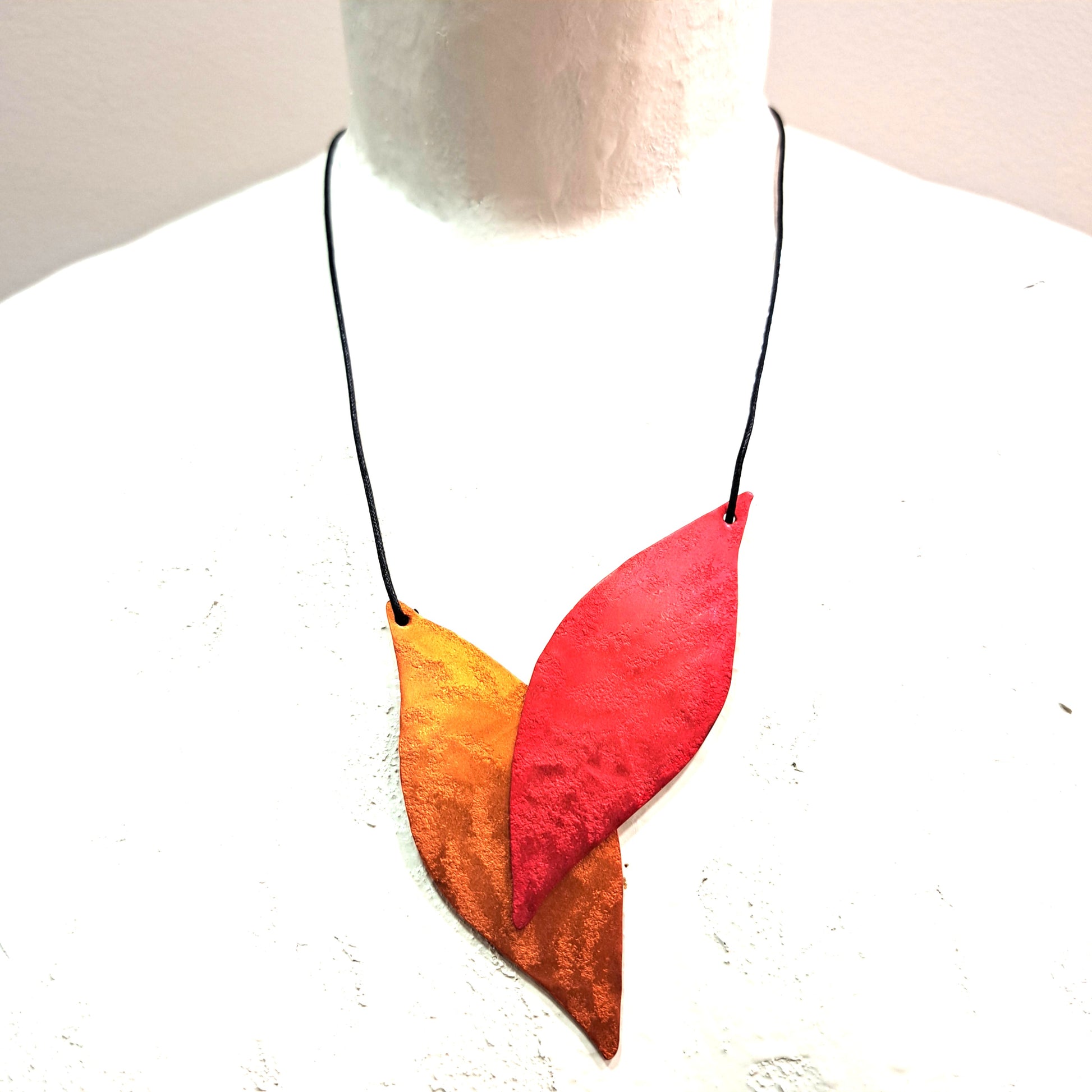 Ce collier en aluminium anodisé rouge et orange est composé de 2 feuilles montées sur un cordon noir. Il est réglable de 46 à 52cm.