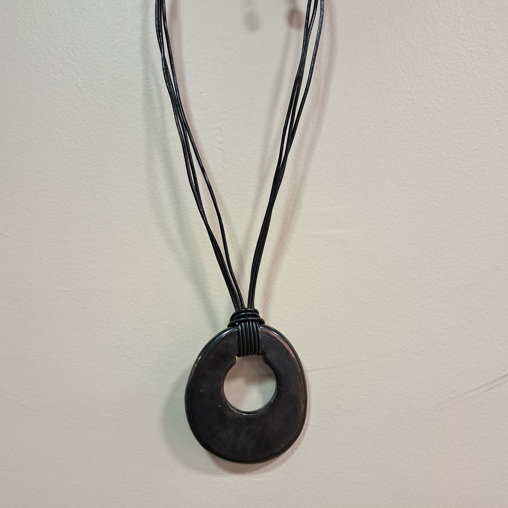 Collier pendentif BULLE noir CHISTINE ALLOING. Collier pendentif en faïence émaillée. Le pendentif mesure 7cm x 7.5cm. Tour de cou ajustable en cuir de 50cm à 55cm.