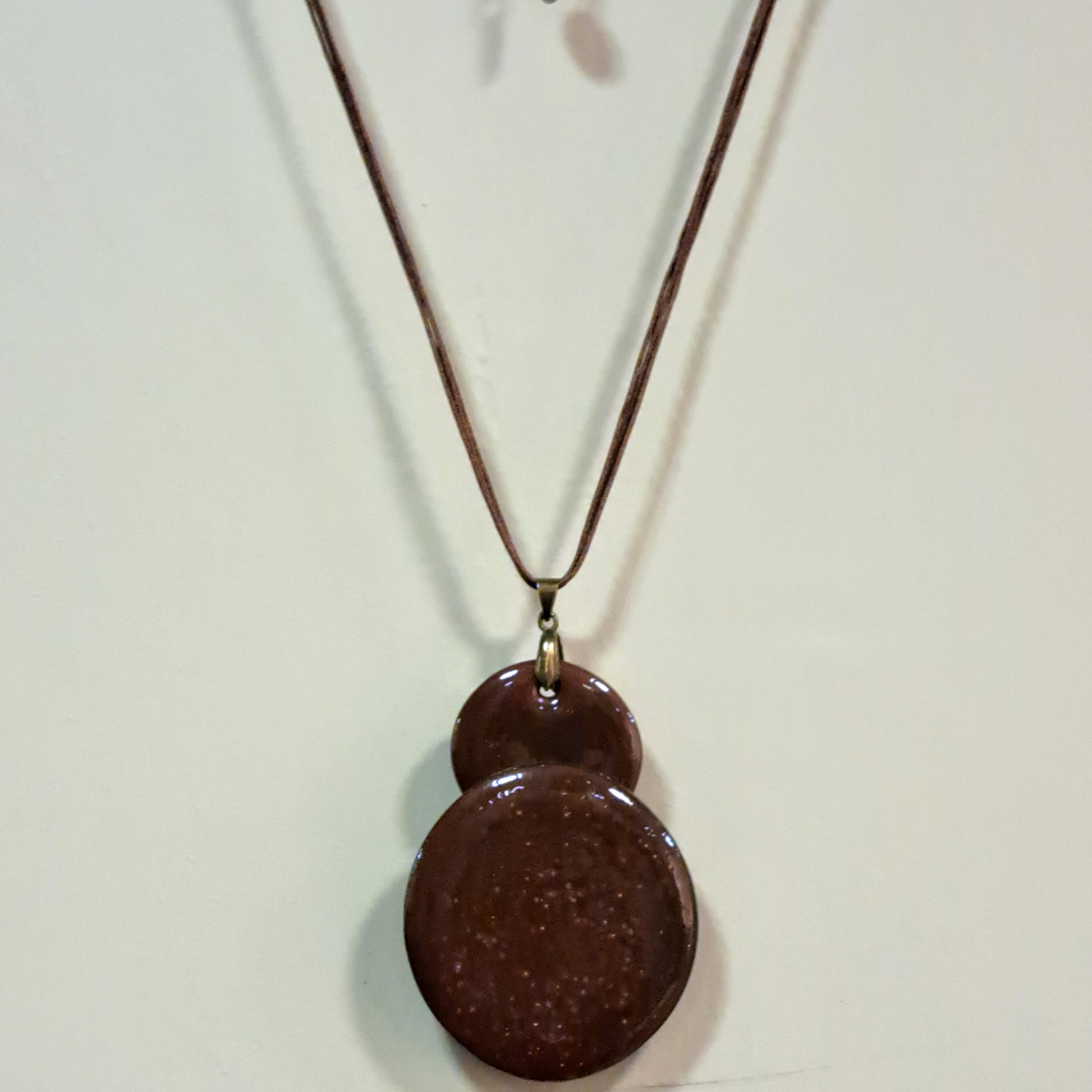 Collier pendentif DUO ROND marron chocolat CHISTINE ALLOING. Collier pendentif en faïence émaillée. Le motif mesure 6.5cm x 5cm. Tour de cou ajustable en coton cérusé de 50cm à 55cm.
