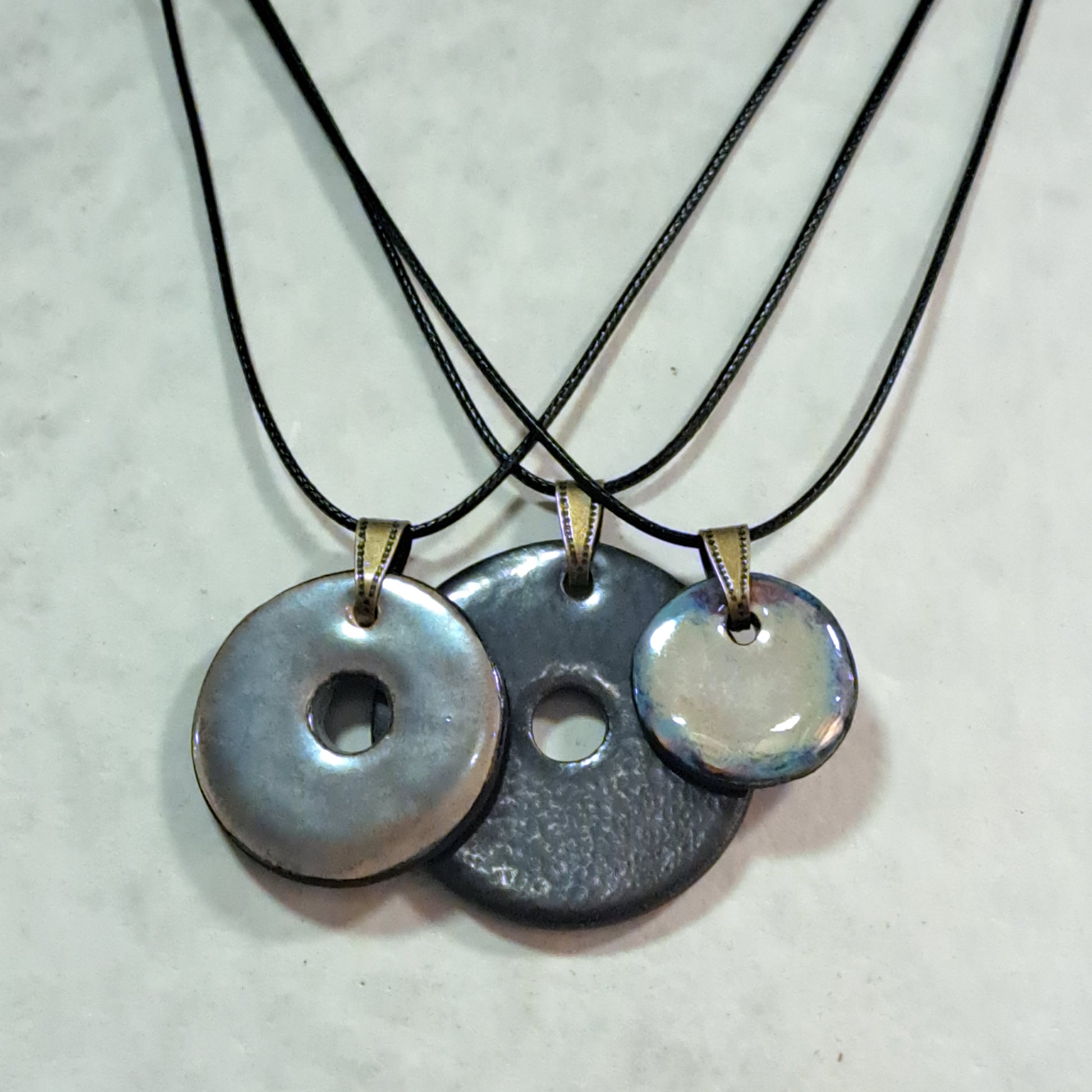 Collier pendentif TRIO noir, marron glacé et mercure CHISTINE ALLOING. Collier pendentif en faïence émaillée. Les cercles mesure 3cm, 2.5cm et 1.8cm de diamètre. Tour de cou ajustable en coton cérusé de 39cm à 45cm.